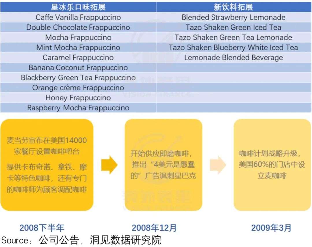 如下图,2004-2008年,星巴克都囿于曾经的爆款星冰乐系列的发掘;与之相比,麦当劳则在咖啡领域,动作不断,甚至依靠高利润的拿铁和卡布奇诺咖啡,一举扭转颓势。