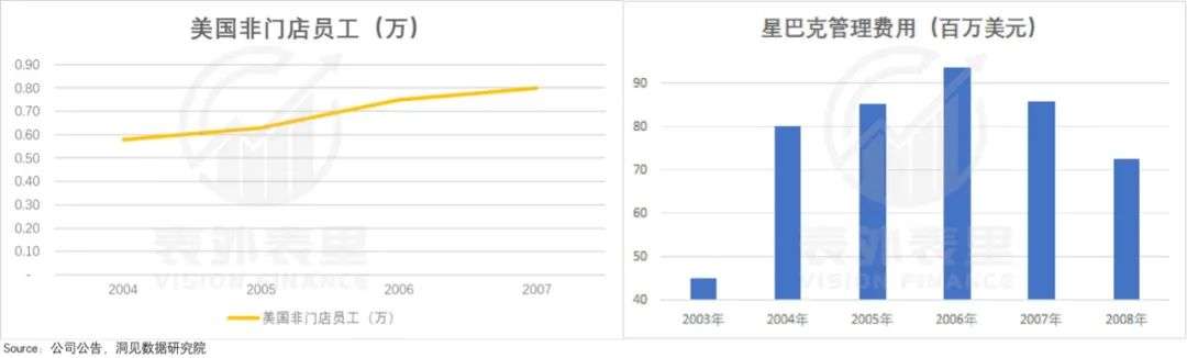 数据显示,2000-2008年,伴随着门店快速扩张,管理难度的提升,星巴克的管理和总部运营等非门店人员数量攀升。这带来了管理费用的拉涨。