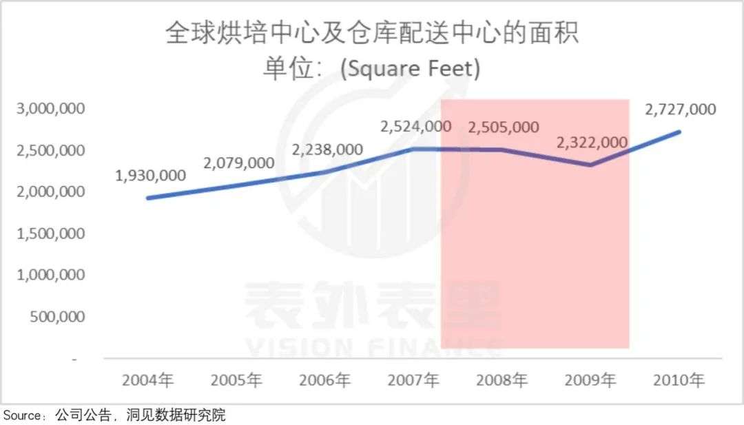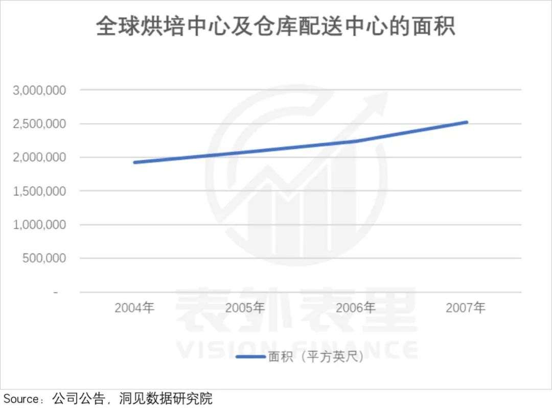 如下图,2004-2007年,星巴克全球烘焙中心及仓库配送中心面积,扩大了接近600平方英尺;仓储配送中心数量激增到12家。