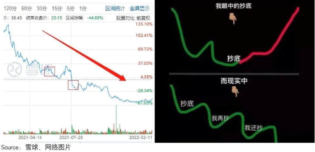 但你若真的选择抄底,很可能会挂在半山腰——毕竟现实中的抄底,往往是右图这样的: