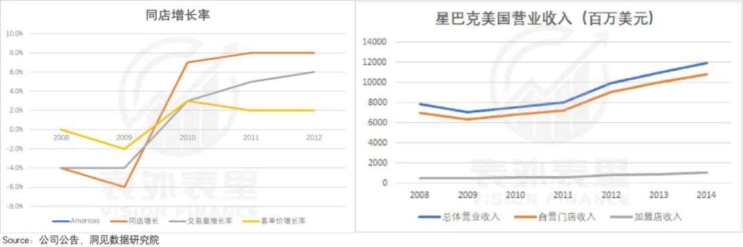 而产品力得到修复,咖啡业务的销售额提升,2009-2010年,星巴克的同店增长率恢复增长,带动了营业收入的整体增长。