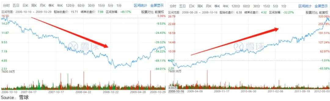 彼时遭遇经营危机的星巴克,股价回撤探底持续了近两年,从接近16美元,跌到了3.5美元,跌幅近80%。但2009年危机过后,股价一路上扬,到2013年小幅回撤前,涨了近7倍。