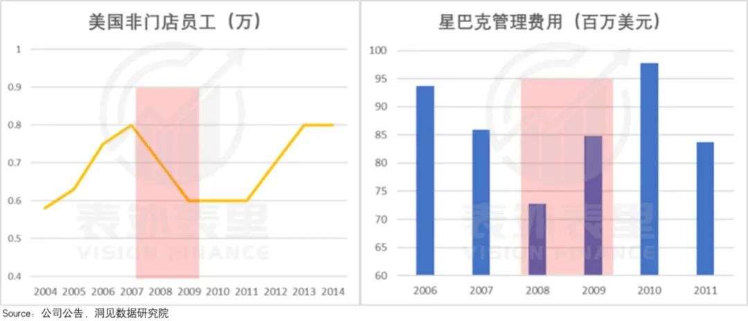 可以看到,2009年星巴克的门店员工减员接近3.2万,单店配备人数从20人降到了14人左右。