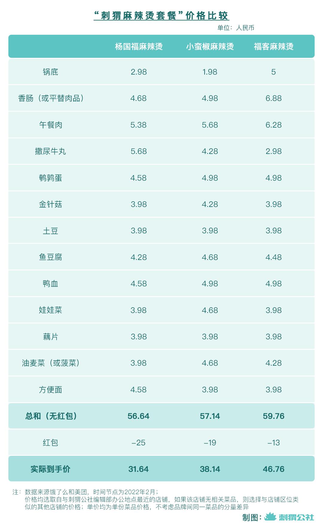由图可见,杨国福麻辣烫的到手价最低,为31.64元,小蛮椒麻辣烫为38.14元,而福客麻辣烫的价格则接近50元,达到46.76元。