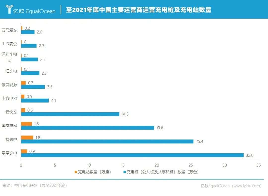 中国充电联盟数据显示,截至2021年底,星星充电、特来电、国家电网、云快充等企业,其运营的充电桩及充电站数量在中国主要运营商中位居前列。