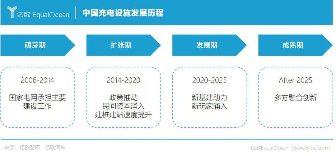 在亿欧智库《2020-2025中国充电基础设施发展预期报告》中,将中国充电设施发展分为四个阶段,如今正是新基建助力,新玩家涌入的发展黄金时期。