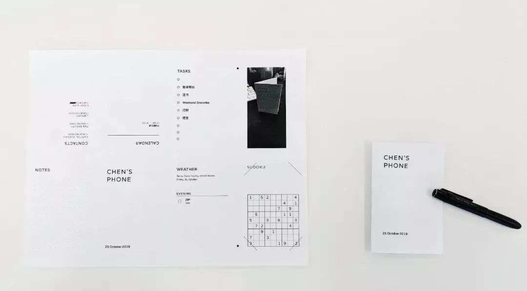 这台“纸手机”就是一张纸叠成的。每天早上我把今天要办的事、要去的地方、要联系的人都准备好,然后用打印在一张纸上,今天就带着这张纸出门了。甚至这台“纸手机”上还有游戏,包括数独 (sudoku)、迷宫、字谜等。