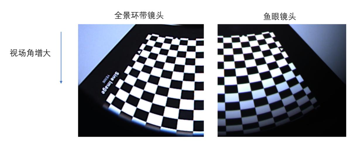 随着视场角增大,全景环带镜头相对照度无变化,全视场照度均匀;棋盘格无压缩,畸变从光学设计角度就得以改善。而鱼眼镜头相对照度降低,边缘视场出现明显暗角;棋盘格出现明显压缩,畸变严重。
