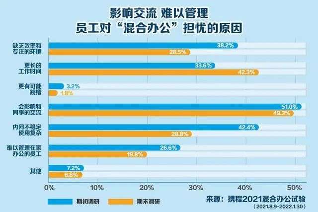 虽然“混合办公制度”对于企业、员工、社会是多赢的结果,但企业也必须面对新的制度实施中所面临的问题。携程调研中,也有部分员工和主管表达了对这个模式的担忧,其中,“担心影响同事关系”占近50%。而作为主管,还会有“担心难以管理”等问题。携程人力资源部相关负责人介绍,接下来公司将重点探索提升远程办公效率和对主管赋能。