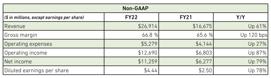 2022财年,英伟达营收269.14亿美元,同比增长61%,超出分析师预期,全年Non-GAAP净利润为112.59亿美元。