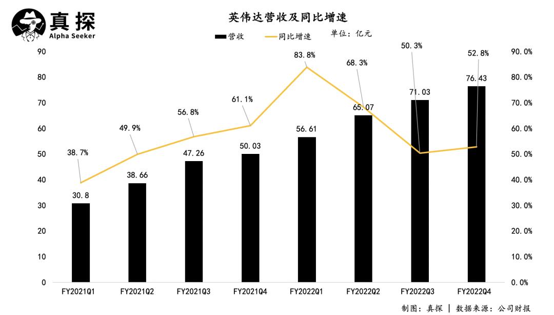 汇报财季内,英伟达营收为76.43亿美元,超出华尔街预期,同比增长52.8%,环比增长8%;