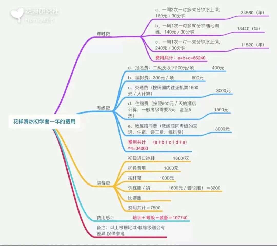 硬件装备都准备好了,可真正学习起来,课时费和训练费才是开支中的大头,不算场地费(有的地方也叫做“上冰费”),一对一教练半小时的费用就从200到几千不等,就算一周两次,一年的支出也是2万打底。