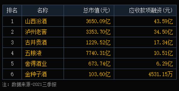 而且,数据显示,截至2021年第三季度末,山西汾酒的应收账款融资高达43.59亿元,同比增幅超过49%,而且这一数据位居行业首位,超出第二名泸州老窖近10亿元。