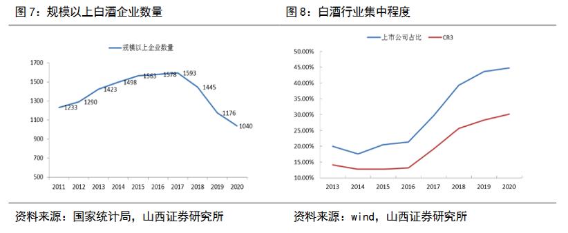 其实,随着白酒产量见顶并下滑,从2016 年的1358 万千升下降到2020 年的741万千升,“马太效应”愈发明显。据国家统计局数据,2020年全国规模以上白酒企业1040 家,比2019年减少58家,已连续三年下滑。