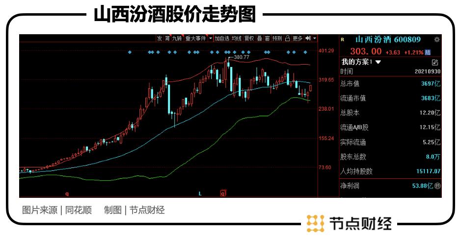 从资本市场来看,山西汾酒目前的表现还算对得起投资者。在茅台、五粮液等大幅回调的情况下,截至2月16日收盘,山西汾酒股价为299.16元/股,总市值3600亿元左右,相比去年380元/股时的高点回调约20%,这个跌幅远好于老大老二。