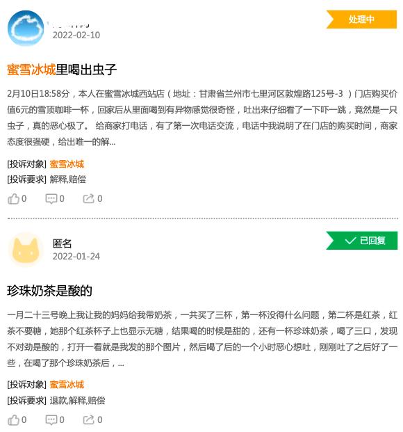 最直观的是,仅从食品卫生这一维度来看,蜜雪冰城可以说是当下被投诉最多的品牌。蜜雪冰城冰激凌有头发、饮料有异物、喝出虫子……截至2月16日,黑猫投诉平台上,“蜜雪冰城”相关投诉量达1933条。
