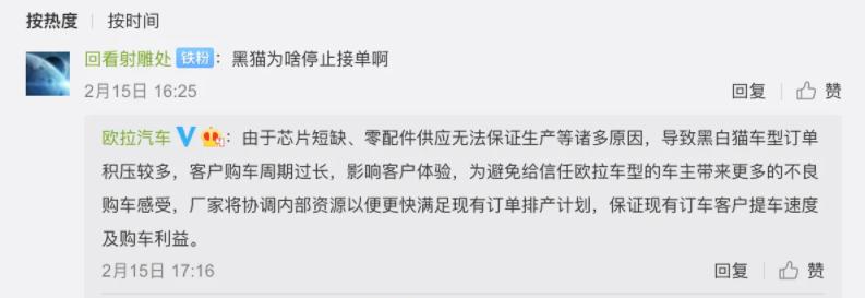 另外,针对黑猫、白猫停产的消息,欧拉汽车在微博上也作出了回应:由于芯片短缺、零配件供应无法保证生产等诸多原因,导致黑白猫车型订单积压较多,客户购车周期过长,影响客户体验,为避免给信任欧拉车型的车主带来更多的不良购车感受,厂家将协调内部资源以便更快满足现有订单排产计划,保证现有订车客户提车速度及购车利益。