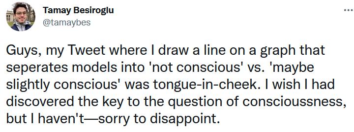 2月17日早上,贝西罗格鲁不得不澄清:「大家淡定,之前我在图上画线那条推特是开玩笑的,线是假的,研究是真的。我倒是希望自己发现了AI获取自主意识的秘诀,可惜天不假人。」