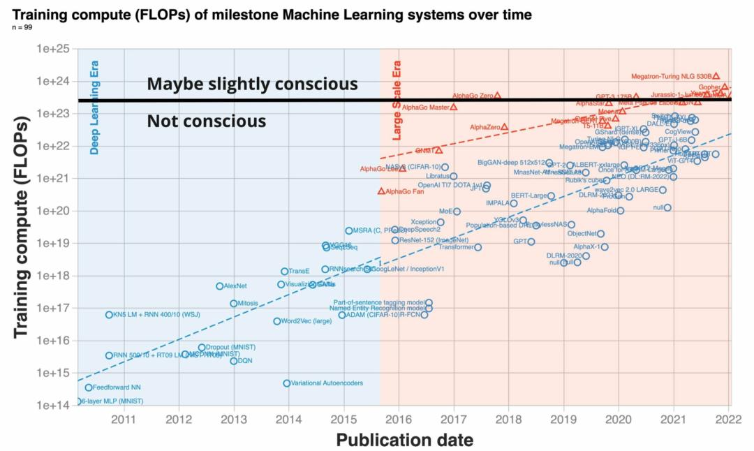 MIT的访问研究学者塔米·贝西罗格鲁在布满了机器学习模型的图表上画了「一条线」,界线以上即是模型「有微弱意识」的程度。