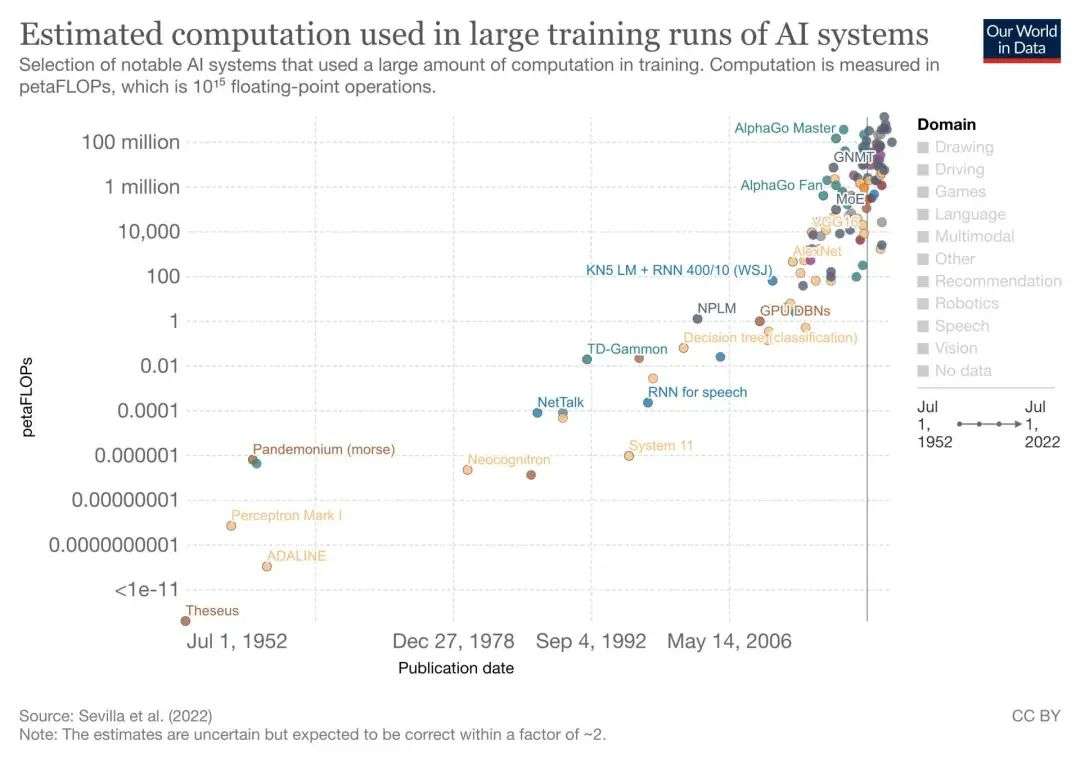 数据报道网站「用数据呈现世界」(Our World in Data)有AI系统训练计算量的逐年与分领域趋势图。