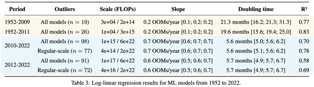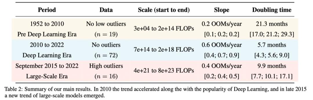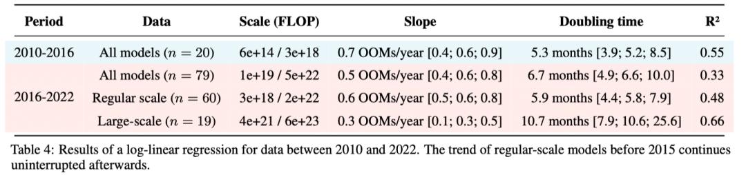 在此之前,训练ML系统所需的计算量每17至29个月翻一番。随后,整体趋势加快,每4到9个月翻一番。