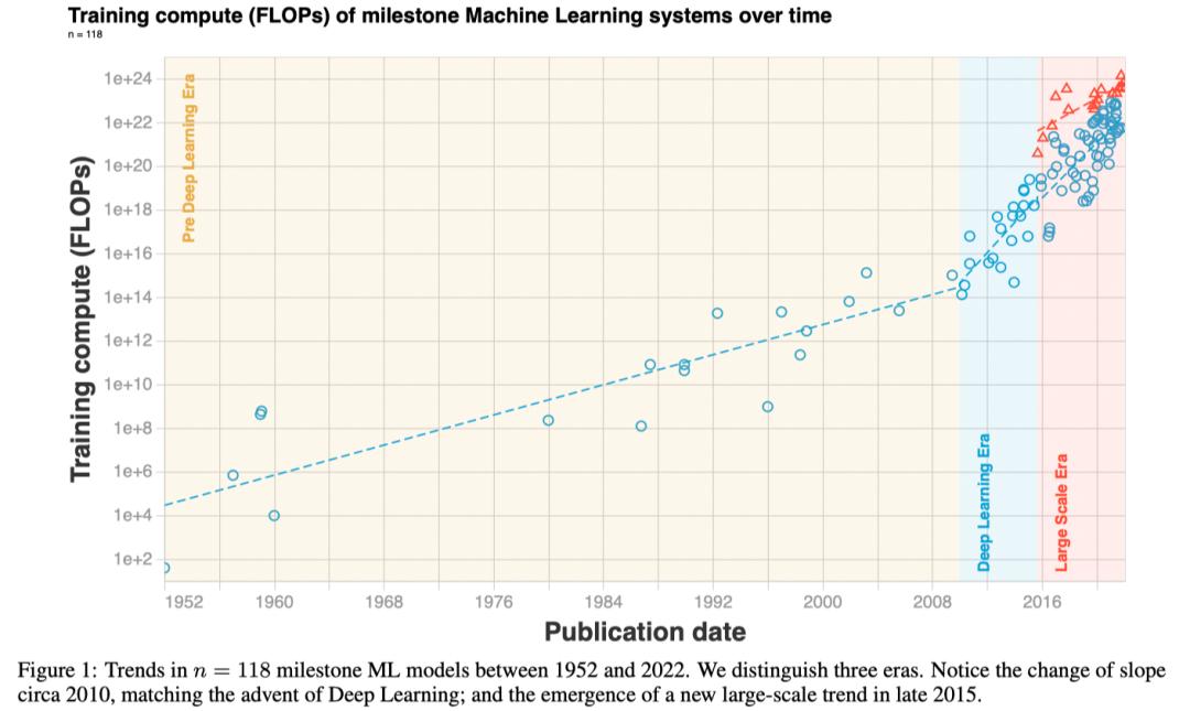 这张图出自在他与别人合著的预印本论文「Compute Trends Across Three Eras of Machine Learning」里,其中记录了自1950年代「机器学习」概念产生以来的业界几乎所有重大的研究。