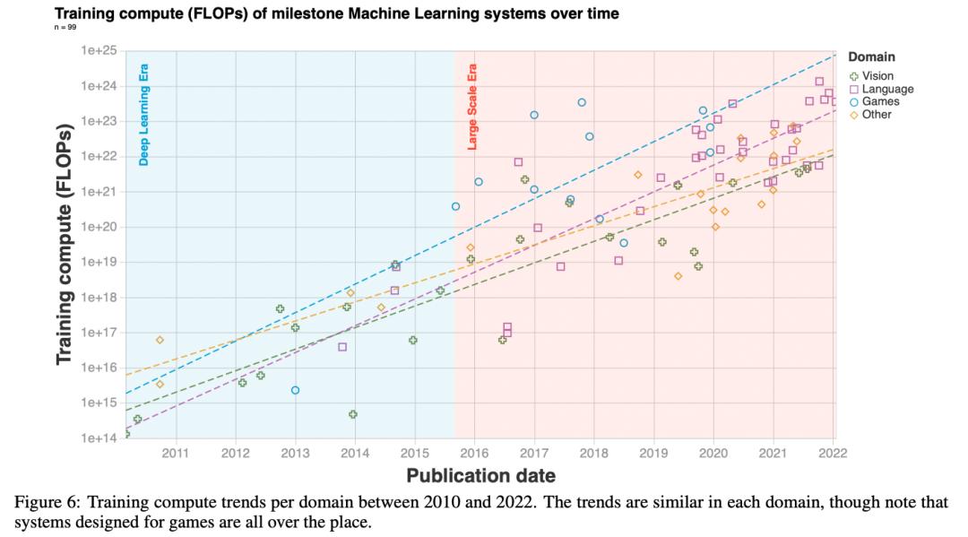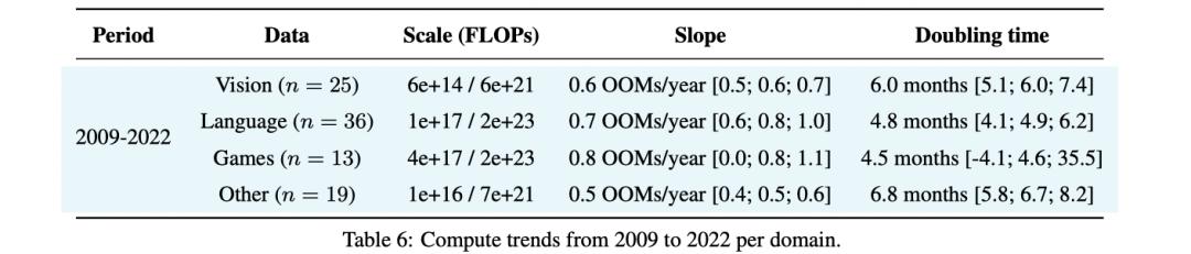 由此,作者调查了视觉、语言、游戏和其他12个领域的机器学习模型训练计算量增加趋势。