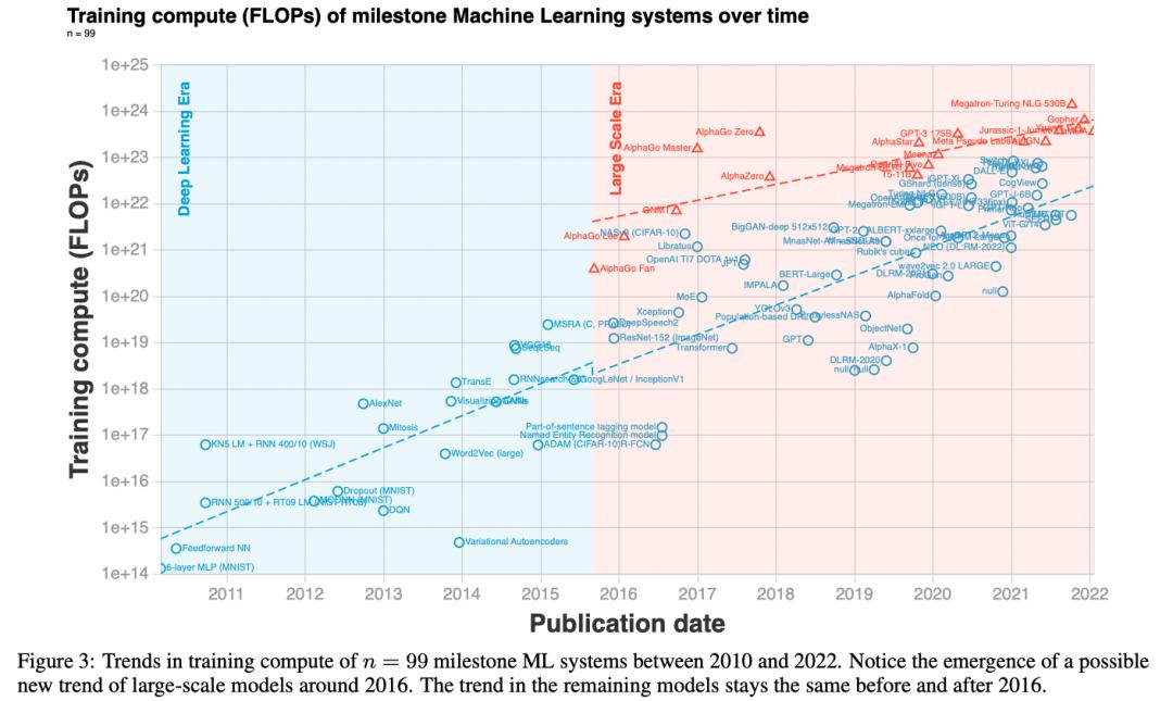 2010年至2022年期间,n=99个里程碑式ML系统的训练计算量的趋势
