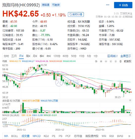 一面要建设主题乐园,一面与肯德基联名,泡泡玛特行动不断,但在二级市场的表现确实有些不太理想。据雪球网数据显示,泡泡玛特在1月20日股价迎来52周最低点每股39.15港元,相较于最高点每股107.6港元下降一半还多。