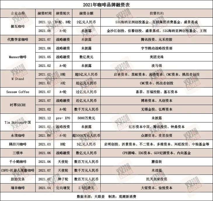 还可以明显看到,2020年,资本对咖啡市场的关注度主要集中在线上品牌;2021年则是集中在线下连锁精品咖啡。