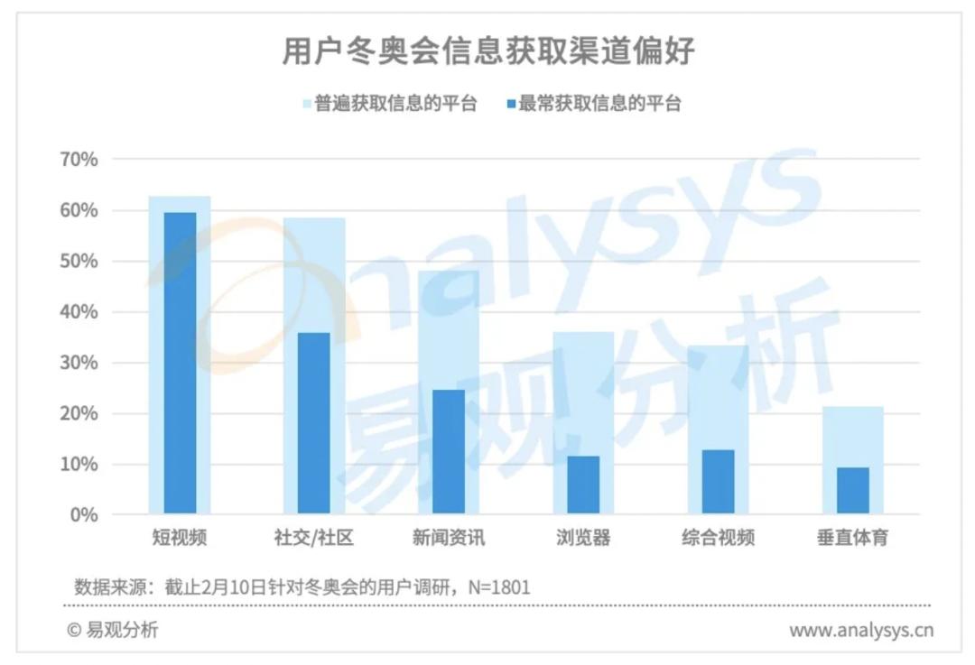 本届冬奥,长短视频的格局或将继续演变。易观分析的用户调研结果显示,赛事期间,各类线上平台中,超过60%用户更偏好通过短视频渠道获取信息。