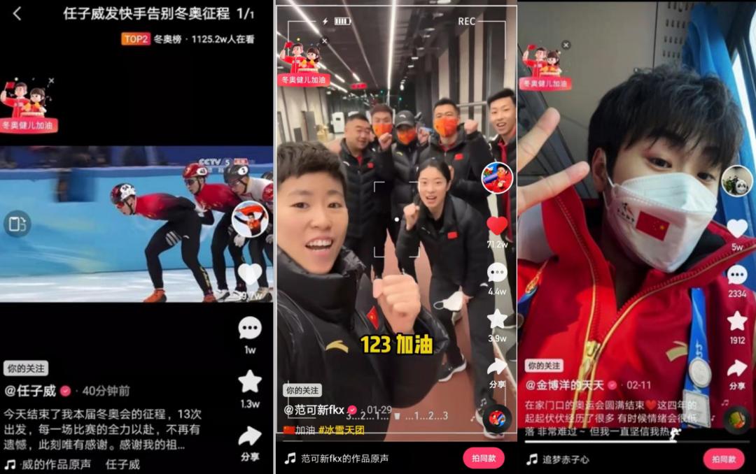 超出他预期的是,“原以为只有夺金的运动员才能收获关注”,可比赛还没结束,选手在社交平台的粉丝数就疯狂上涨,赛后,观众还会关注他们的直播连线。截至目前,谷爱凌在抖音的粉丝数、任子威在快手的粉丝数都超过千万。