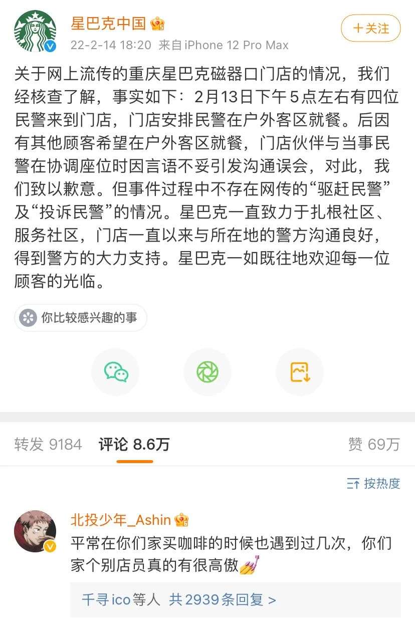 涨价热搜之前,星巴克高挂热搜榜是“驱赶民警”事件。