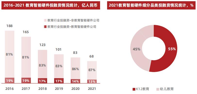 而与政策利好相对的是,行业投融资市场态度「趋冷」。根据市场公开数据,2021 年教育智能硬件市场共发生 44 次融资,相对 2020 年在融资数量和融资整体规模上均有小幅收缩,单笔融资金额从数百万人民币到 2 亿美金不等。在类别分布上,虽然 K12 教育方向的教育智能硬件公司占比下降,但仍占到市场融资的大头,同时学前教育方向的智能硬件公司融资占比有一定提升。