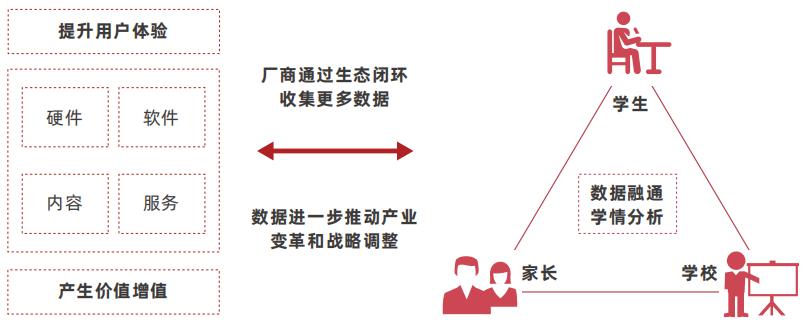 实现融通的不仅有教育端,更有产业端。在产业端,教育智能硬件厂商打出「数据+服务+内容+硬件」组合拳,为用户提供更好的产品体验,并挖掘各个环节自有的增值价值。同时,厂商也通过学校、学习者和家长形成的生态闭环大量收集数据,这些数据经由 AI 系统进行学情分析,一面可以让用户深入掌握学习者的学习情况,根据学习者特征提供适应性的学习资源与服务,反过来也能够助推教育智能硬件公司做出战略性调整。