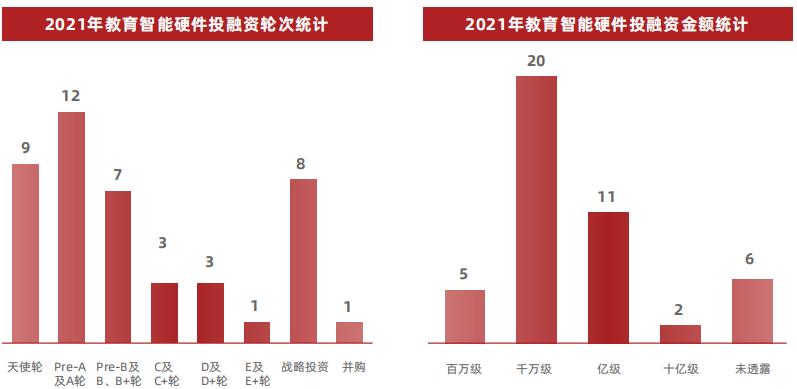 从轮次分布看,2021 年教育智能硬件市场的投融资轮次主要集中在 A 轮及以前,共产生 21 起投资事件。金额方面,则以千万级和亿级为主,但也不乏十亿人民币级别投资。投融资品类重点分布在机器人等应用广泛的硬件产品上。