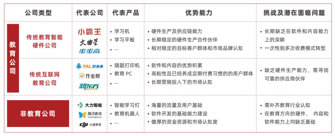 另一方面,非教育公司投身「战局」,寻求开源冲破瓶颈。如今在教育智能硬件「争夺战」中,也能看到互联网及科技公司的身影。随着业务增长出现瓶颈,大量互联网公司开始激进探索行业新机会,教育智能硬件成为他们寻求开源的渠道之一。