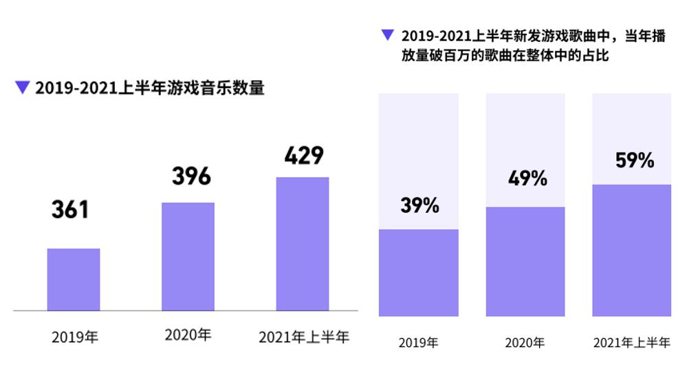 根据腾讯音乐数据研究院于今年1月底发布的《游戏+音乐:双赛道加持下的热门生意》研究报告,2019年至2021年上半年,游戏音乐生产规模呈逐年增长的趋势,2021年上半年的游戏音乐数量已经超过2020年全年。其中,播放量突破100万的游戏歌曲数量在整体中的占比正在逐渐上升。
