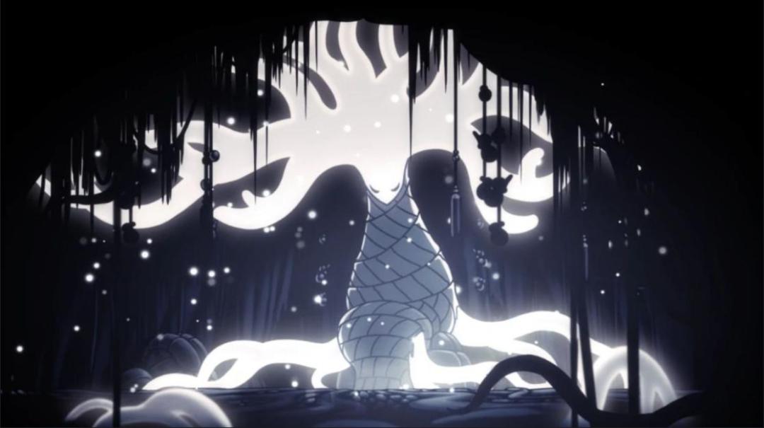 有趣的是,我们能够通过音乐来揣测剧情人物的身份,例如在遗忘十字路所遇到的第一位主线Boss“假骑士”,其背景音乐就是这段主题旋律的变奏形式。为什么代表主角的旋律会用于这个假骑士?随着剧情的发展,玩家会发现“假骑士”是整个王国最弱小的生物,它的铠甲只不过是偷来保护自己的,因此它的角色曲使用的也是从主角这里偷来的旋律。