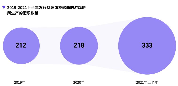 同时,2019年至2021年上半年,游戏配乐的发展同样也呈现了明显的增长态势。2021年仅上半年,发行华语游戏歌曲的游戏IP所生产的配乐数量达到了333首,较2020年全年增⻓了52.7%。