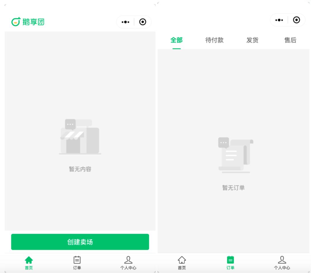 在鹅享团的首页,团长需要创建一个“卖场”,卖场内陈列着团长的商品。团长可以将商品分享到微信群和微信好友内,当有用户购买商品后,团长会在后台收到订单信息,然后由团长开始发货,发出的商品信息会在展示在“订单”中。此外,团长还可以在“订单”页面查看商品付款状态以及售后情况。