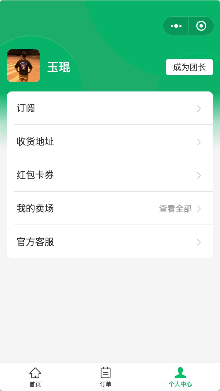 在鹅享团的个人中心内会展示团长的基本信息,以及一些其他的基础功能,比如收货地址、红包卡券、官方客服和我的卖场(类似于微信小商店的商品橱窗)。