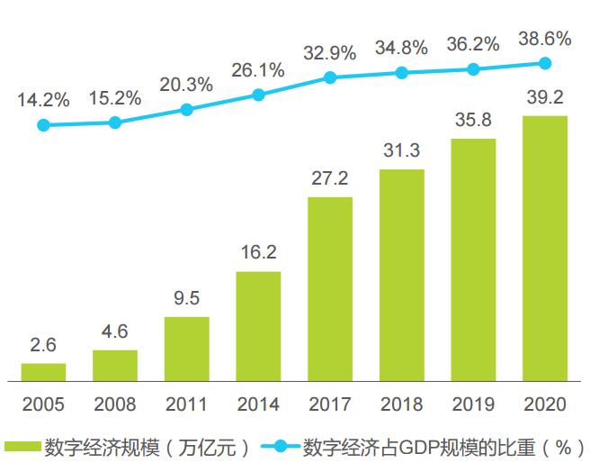 照例先摆数据。伴随着人工智能、大数据、云计算、5G等数字化技术的蓬勃发展和数字化的加速渗透,数字经济的体量日益增大。根据中国信通院数据,数字经济规模占全国GDP比重已从2005年的14.2%跃升至2020年的38.6%。也就是说,当下我国经济中已有接近4成是与数字经济相关。