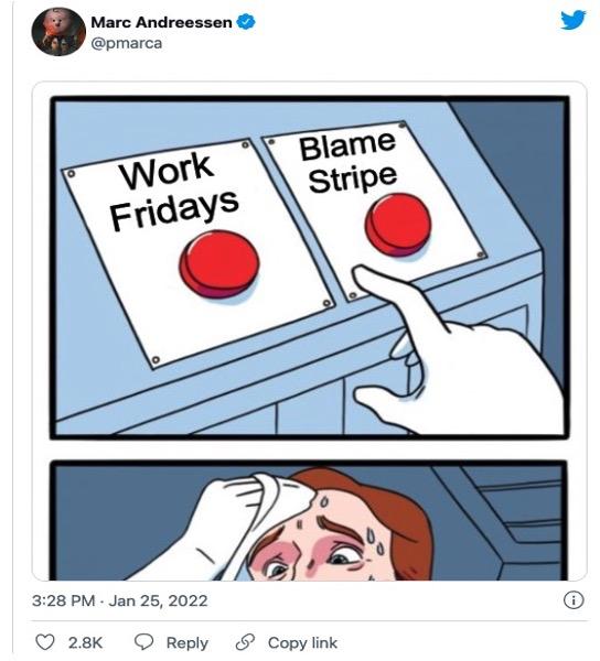 除了YC和红杉外,A16Z的掌门人Marc Andreessen也以一个梗图加入了“战局”。就在不久前,Bolt宣布公司将永久执行4天工作制度的消息曾在科技圈刷屏,而在Marc Andreessen发布的这张图中,给出了两个选项:“工作五天”还是“指责Stripe”,暗怼了Ryan Breslow对Stripe所发出的一系列抨击。