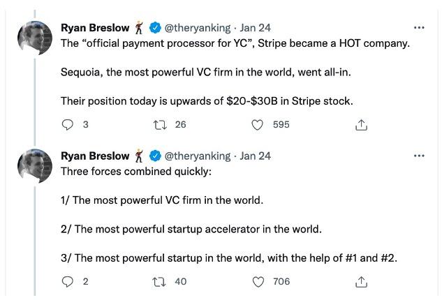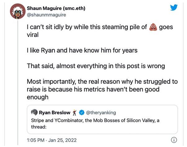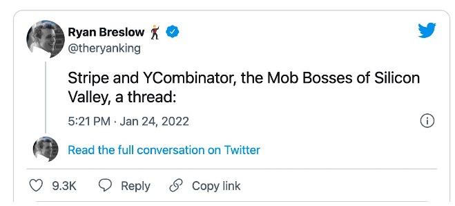 上个月底,金融支付公司百亿独角兽Bolt的创始人 Ryan Breslow突然在推特上发布长文,点名指责全球估值第三的创业公司Stripe、硅谷最著名创业孵化器YC和规模最大的风投之一红杉资本,带头在硅谷拉帮结派、打压非派系内的公司,并且怒斥他们在硅谷完全扮演起了“黑帮老大”的角色,控制舆论场和合作渠道,严重危害了硅谷的创业生态。
