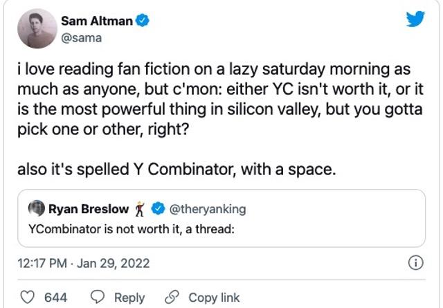 前YC掌门人、Open AI CEO Sam Altman针对Ryan Breslow的发文表示,“我和其他人一样喜欢在慵懒的周六早晨阅读粉丝小说,但拜托:要么YC不值得,要么它就是硅谷最强大的东西。你必须得选择一个,对吗?”言辞之间暗讽Ryan是因曾经进不了YC而产生了不平衡心态。
