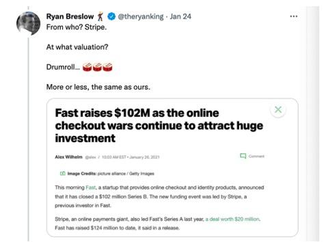 几乎是在一夜之间,Bolt就多出了一家跟其估值相近、并且拥有充足现金流的竞争对手。而Breslow认为,这背后完全是因为Fast去认了Stripe做大哥,并自愿给Stripe缴纳高额的“保护费”。