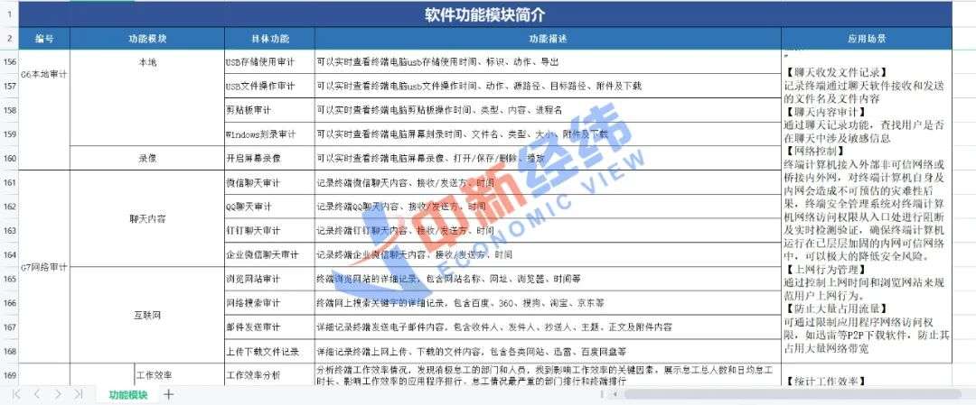 据该工作人员发来的一份“功能详情”显示,网管家将用户监测功能分为设备管控、终端管理、网络管理等二十多个模块,涉及员工网页浏览、软件使用等几乎所有上网行为,管理者还可通过屏幕录制留存证据。