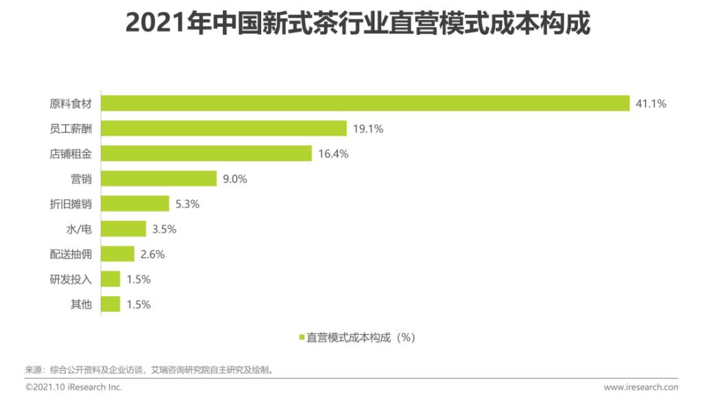 但它们的共同问题在于,对供应链上游原材料的掌控力不足——尤其是在需要不断推出新品刺激消费者的情况下,原材料的成本变得更加不可控。根据艾瑞咨询统计的数据,国内连锁新式茶饮品牌的成本结构中,原料食材成本占比最高,为41.1%,是员工薪酬、店铺租金之和。
