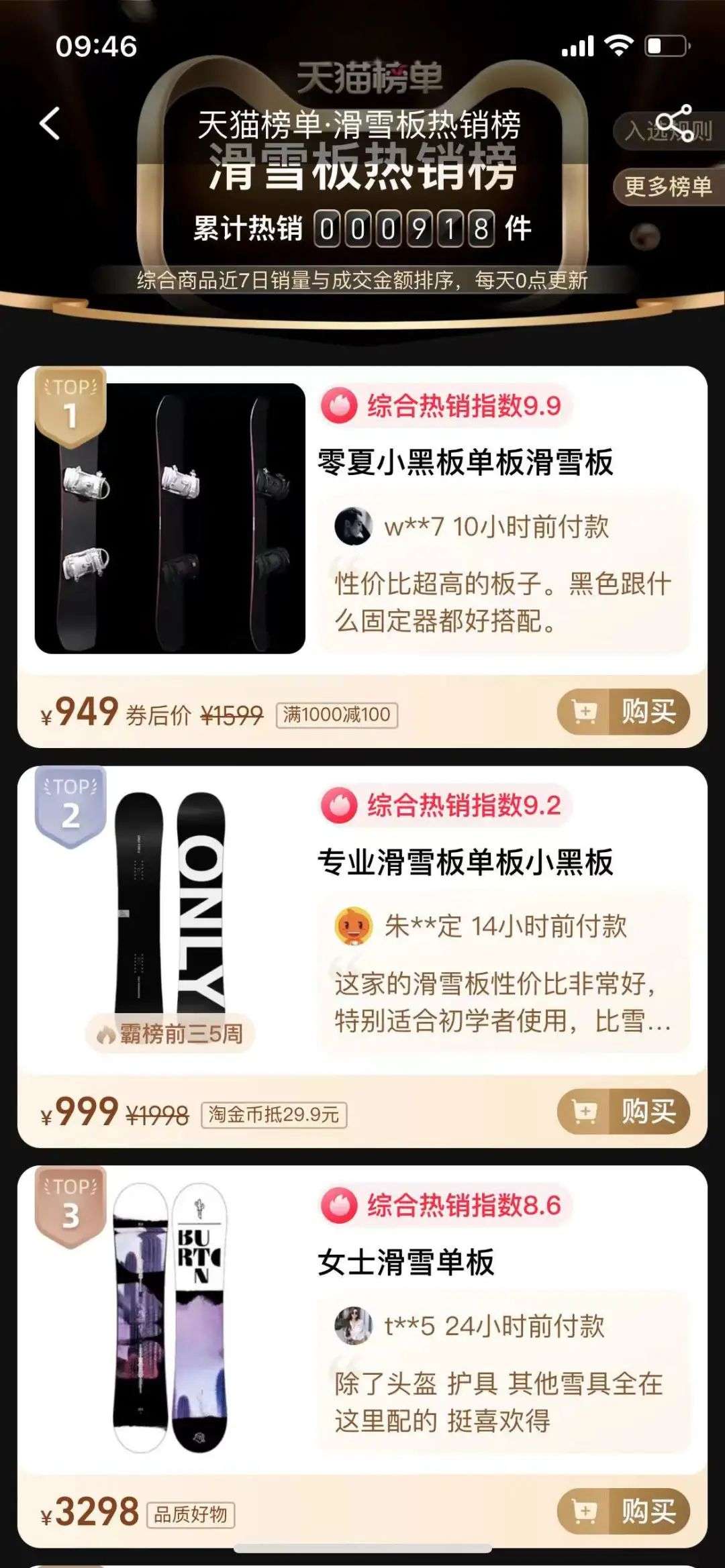 雪板种类划分如此细,售价自然不同,即使同一种类雪板的价格也差距很大。在天猫滑雪板热销榜中,排名前十的滑雪板大概可以分成两类:一类是针对初学者比如零夏品牌,划分出不同滑雪板组合,包括固定器、雪鞋等,价格在999~4297元;另一类专业滑雪板的价格通常由滑雪板的性能决定,双向韧度、板芯承受冲击强度、固定器适配度、“响应”灵敏度等都会影响价格,比如Faction Agent4.0双板价格就高达7000多元。